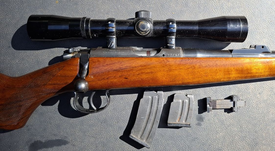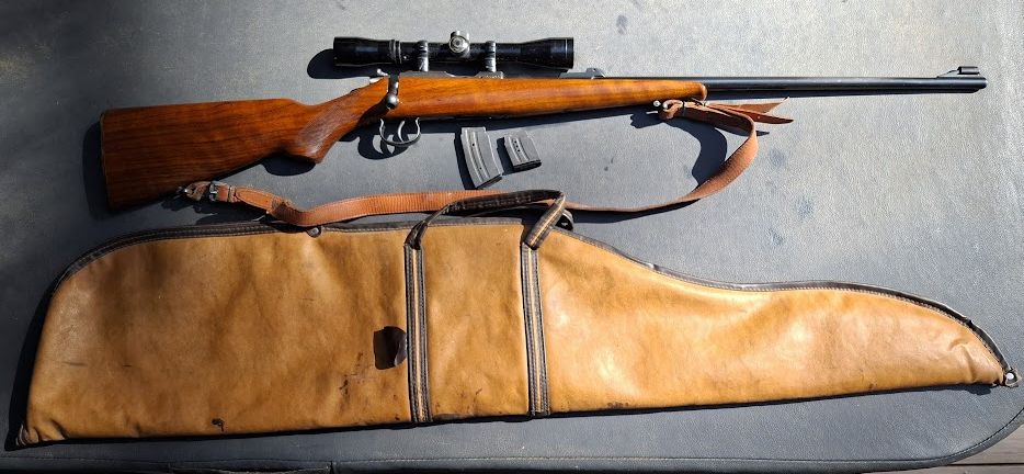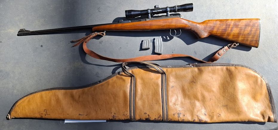 Quality rifle with sholder strap, in a soft case, scope, (plus fixed sights), 5 & 10-shot magazines .